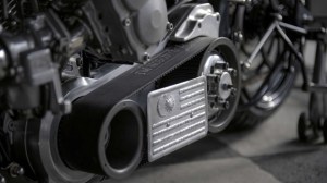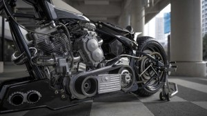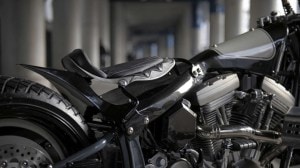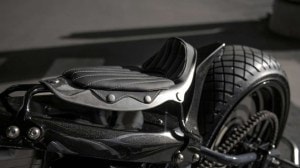 Next the team turned to the fuel tank of the modified Harley-Davidson Monster and essentially replaced it with a smaller than the stock unit, even further placing the engine at centre stage. The tanks sheet metal seamlessly wraps around the frame so that one component morphs into the next. These lines run all the way along the backbone where they form the sharp rear fender.