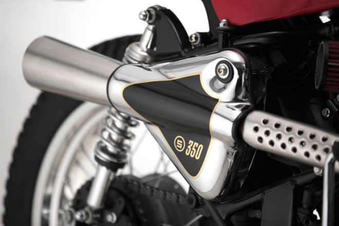 The custom built Royal Enfield Bullet 350 scrambler was fitted with a high0riding stainless steel exhaust system. The subframe was completely redone and an oxblood leather seat replaced the original unit. A little ducktail finishes off the rear fender and it gets a neatly tucked-away LED taillight.