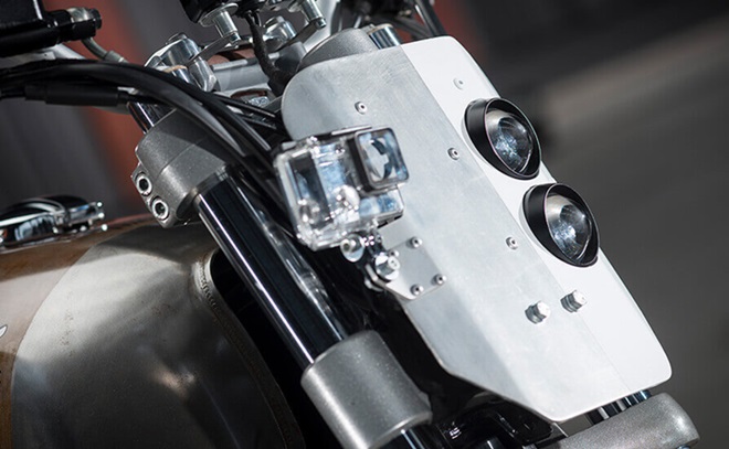 At the front end, the headlamp and instrument cluster were redesigned to be more durable and purposeful. Handcrafted to house two stacked projector lamps, number plate and a small, digital meter to replace the bulkier stock units. The new design also adds a GoPro camera up front to record all the fun the rider will have on the bike.