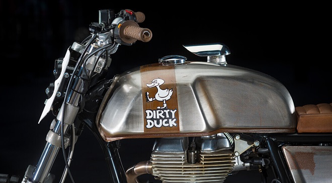 The seat of the modified Royal Enfield Continental GT Dirty Duck has been built by hand and wrapped in oiled leather. The fuel tank has been naturally rusted. About the Dirty Duck, Royal Enfield says that it can be pushed to its absolute limits.