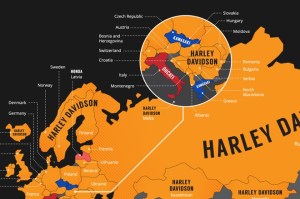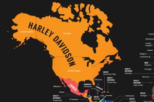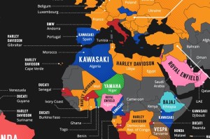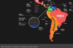 The team used Google Keyword data to work out how often a motorcycle brand is searched on the Internet in a country. All of the North American continent is a Harley-Davidson fan with the exception of Mexico which likes Honda more, and Honduras that likes Kawasakis.