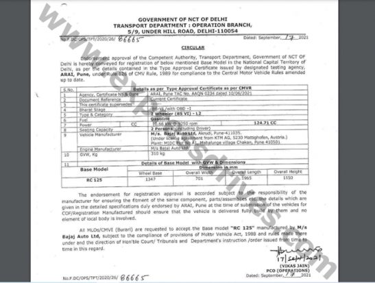 The new 2021 KTM RC 125 is all set to be launched in India in the next few days. Ahead of the official launch, we have managed to get hold of a document on a government website that reveals some specifications of the upcoming 125cc supersport. As per the document, the new 2021 KTM RC 125 will be powered by a 124.7cc engine that is good for developing a maximum power output of 14.2 hp at 9,250 rpm. In addition, the dimensions of the motorcycle have also been revealed. According to the leak, the new KTM RC 125 will measure 1,965mm in length, 701mm in width, and 1,150mm in height.