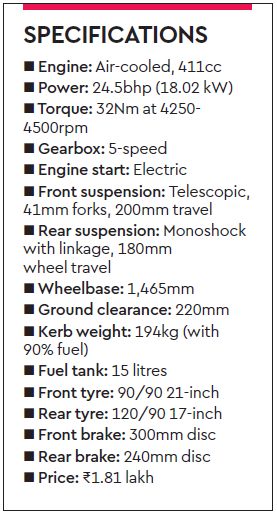 But first, the design: The Himalayan doesn’t look vastly different from most touring motorcycles, though it’s marginally smaller, and thus better to manoeuvre. The front end, like most touring bikes, is tall. The front suspension is telescopic, with 41mm forks and 200mm travel. The monoshock rear suspension with linkage allows for 180mm wheel travel.