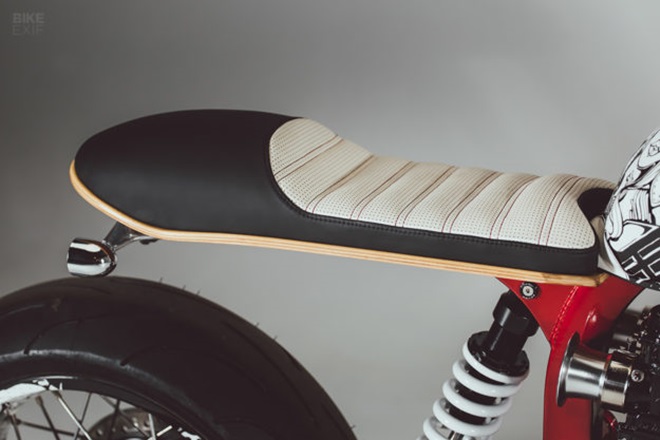 Speaking of skateboard and custom bike connection, the first thing to catch the eye on the custom Triumph Thruston is the skateboard deck seat, and the monoshock setup just beneath it.