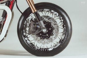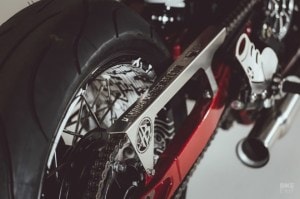 Hans Bruechle’s lot of work is in black and white, and that is what was settled on for the Triumph Thruxton’s paint job. But Hans thought that it needed a hint of colour, and that is how it was decided the frame and swingarm would be powder coated with cherry red. And the chain guard is a one-off, adorned with Hans’ logo and web address.