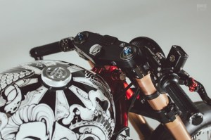 The seat has a stunning black and white upholstery from Poli Motor Trimming, who mostly work on exotic cars. The front end of the custom Triumph Thruxton has been fitted with forks from a Suzuki GSX-R1000 and hence is much beefier than before.