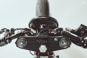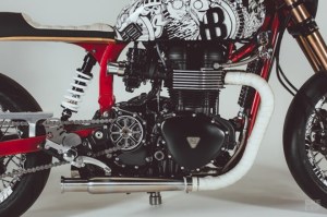 Speaking of skateboard and custom bike connection, the first thing to catch the eye on the custom Triumph Thruston is the skateboard deck seat, and the monoshock setup just beneath it.