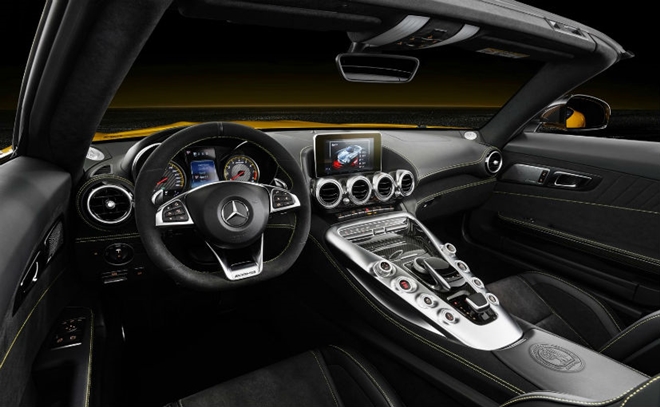 The interiors of the Mercedes AMG GT S Roadster are also as breathtaking as the exterior. The car gets low set seats so that driver gets a pure sportscar experience. The all black seats have been coated in Artico man-made leather. The instrument cluster is all digital and the touchscreen infotainment system at the center is one of the prime highlights of the cabin. The roof of the new AMG GT Roadster S is a three-layer soft top that gets support from a lightweight structure made up of steel, magnesium and aluminium.