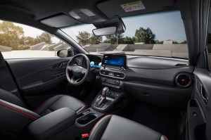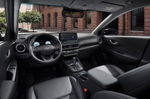 The new Kona interior gets a complete overhaul with new colours and materials. New seat cover options include a black woven houndstooth design, cloth seats with black and grey embossing, and perforated leather seats in black, beige, or khaki. As an option, Kona is also available with a light beige interior trim.