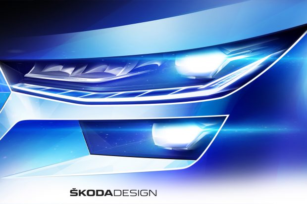 The images show the newly designed LED headlamps. They are now slimmer and continue to feature the squared block fog lamp below. The bonnet will be redesigned with a more upright shape and will lead to the new sharper Skoda signature nose with the double multi-slat front grille. The front bumper will be bolder with new L-shaped elements flanking the wide central air-intake.