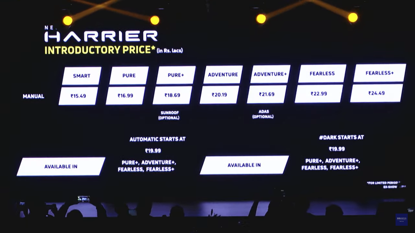 Tata Harrier facelift is also available in 10 variants including Smart (O), Pure (O), Adventure, Adventure+, Adventure+ Dark, Adventure+A, Fearless, Fearless Dark, Fearless+, and Fearless+ Dark.