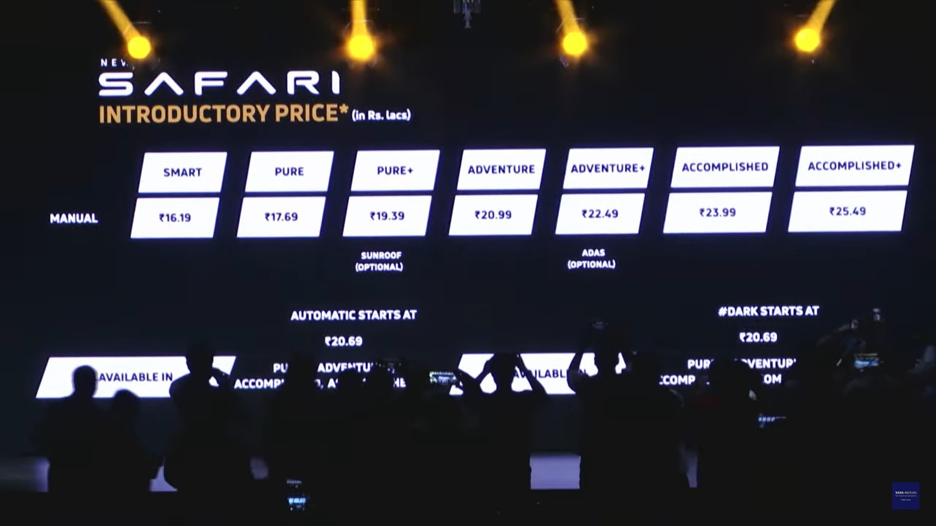 The new Tata Safari is available in a total of 10 variants – Smart (O), Pure (O), Adventure, Adventure+, Adventure+ Dark, Accomplished, Accomplished Dark, Accomplished+ Dark, Adventure+ A, and Accomplished+