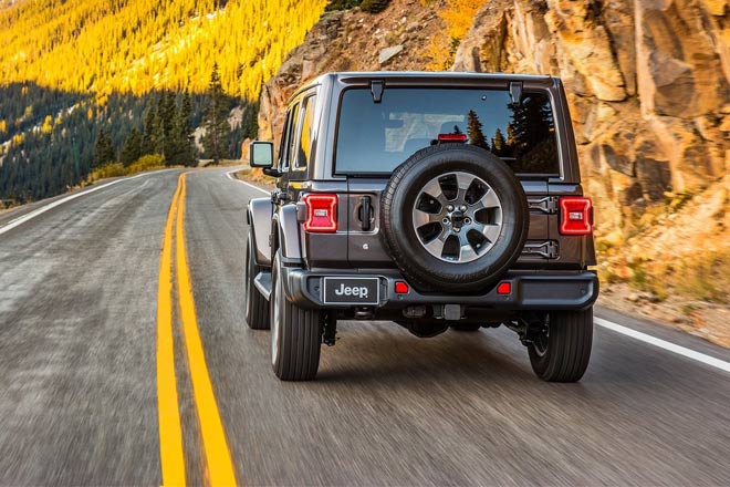 The exterior of the Wrangler, although looks similar to the previous one, the styling is new. The front has been designed to be reminiscent to the original Jeep CJ5, the round headlamps are now LEDs and taper into the outer slats of the 7 slat grille, the beltline is lower, the tail lamps are larger with LEDs, the spare tyre is placed lower on the tailgate which helps improve rear visibility. Being a Wrangler, the front windshield can be folded down or removed entirely, the solid roof is also removable and the doors not are made from aluminium making them easier to remove than before.