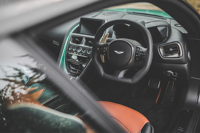 The DBS 59 builds on that racing pedigree and is inspired by the race car. all 24 examples will be finished in the same British racing green exterior colour worn by the race cars from 1959. The roof will have a gloss finished carbon fibre. All the badging on the exterior will be finished in bronze instead of the shiny silver from the standard car as a nod to the bronze switches and dials on the Le Mans winner, while the Aston Martin badge on the bonnet features the Union Jack. The DBS 59 gets a bespoke front grille, brake callipers and 21” forged Y spoke satin duotone wheels.
