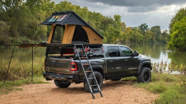 The Hennessey Mammoth TRX truck offers 1012 hp of power with a 4X4 system that claims to be tailored with a wide range of user-friendly equipment for truck-based living. The modular system uses a full TRX bed rack as its foundation, topped by a hard-shell rooftop tent further claims to take only minutes to set up. It also gets a retractable 55-inch awning to provide shade and shelter, while auxiliary fuel tanks and a pressurized water reservoir are also mounted on the rack to increase range and utility. Other accessories include a 28-inch splitting axe, shovel, and LED perimeter illumination, grab handles, and a retractable ladder to improve accessibility to the tent and equipment.