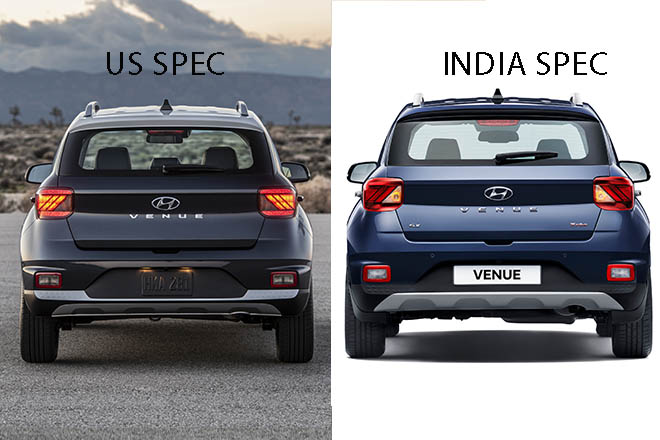 Some evident differences between the US and India-spec models of the Hyundai Venue are on the exterior design of the car. For instance, the headlamps though shaped similarly, the modules are completely different. The US spec has its front fog lamps integrated into the main housing, while the Indian spec gets small circular lamps mounted just above the chin of the front bumper on either side. Additionally, the skid plates are also different. The rear bumper and styling of both US and India-spec models of the Hyundai Venue seem to be quite similar, but there are subtle differences which can be seen in the rear fog lamps and the design of the rear bumper.