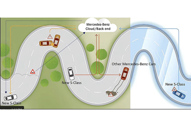 The cloud then sends an alert to all S-Class driving on the route within a 3km radius. This will allow the driver to be aware of the situation and the road ahead.