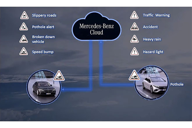 Currently, the Mercedes-Benz ME Cloud is enabled to provide eight alerts on the road. They include Potholes, Speedbreakers, Broken Down vehicles, Slippery Roads, Traffic Warnings, Accidents, Heavy Rain, and Hazard Lights.