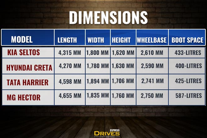 Kia Seltos Vs Hyundai Creta Vs Tata Harrier Vs MG Hector: Dimensions