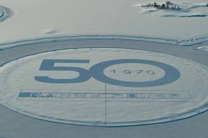 Land Rover is kicking off a year of celebration to mark Range Rover’s 50th anniversary by creating a giant piece of sub-zero art at its cold weather test facility in Arjeplog, close to the Arctic Circle in Sweden. The 260m-wide artwork filled the centre of the steering pad at the test track where all future Land Rover models are tested.