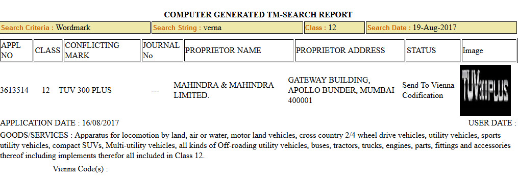 Mahindra and Mahindra have filed a copyright application to reserve the name ‘TUV 300 plus’ confirms a search report on Controller General of Patents Design & Trademarks owned by Ministry of Commerce & Industry, Government of India. If things work as per plan, then Mahindra will launch its latest iteration of TUV 300 in November 2017, a source close to the company confirmed. A computer generated report with application number 3613514 states that Mahindra has requested to patent TUV 300 Plus under class 12 which is reserved for apparatus for locomotion by land, air or water, motor land vehicles, cross country 2/4 wheel drive vehicles, utility vehicles, sports utility vehicles, compact SUVs, Multi-utility vehicles, all kinds of Off-roading utility vehicles, buses, tractors, trucks, engines, parts, fittings and accessories. The department is yet to clear this Mahindra TUV 300 Plus trademark and has sent to verify the Vienna Codification. This is done when the trademark comprises of logo or figurative elements. In this case, Mahindra TUV 300 Plus logo also needs to be copyrighted to be used on the MPV. While the company is yet to reveal any details on the new Mahindra TUV 300 Plus, reports and spy shots suggest that the MPV might now come with an increased wheelbase and a few exterior and interior changes. Mahindra might also offer front facing third row seats as an option along with the side-facing seats offered currently.