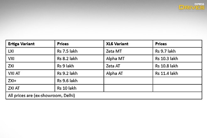 Maruti Suzuki Ertiga and XL6 variant wise ex-showroom, Delhi price comparison: