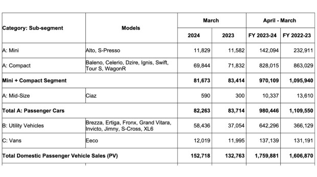 For Maruti Suzuki, the Mini and Compact segment, which consists of the Alto, S-Presso, Baleno, Celerio, Dzire, Ignis, Swift, Tour S, and WagonR registered sales of 81,673 units in March 2024 against 83,414 units sold in March 2023, a YoY decline of 2 percent. During the same period, UV sales registered sales of 58,436 units, a YoY increase of 57.7 percent.
