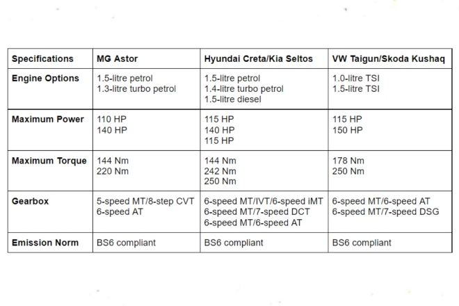 MG Astor vs Creta vs Seltos vs Taigun vs Kushaq: Engine Specifications