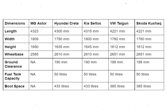 MG Astor vs Creta vs Seltos vs Taigun vs Kushaq: Dimensions