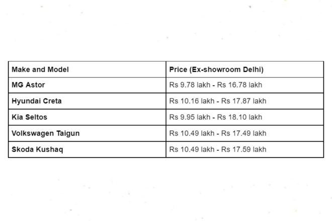 MG Astor vs Creta vs Seltos vs Taigun vs Kushaq: Price in India