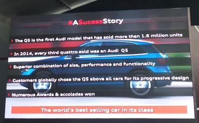 12:30 pm: Audi Q5 is the first Audi model that has sold over 1.6 million units globally. Every third quattro vehicle sold in 2014 was an Audi Q5. New Audi Q5 indeed has a reputation to live up to.