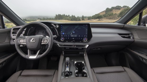 The swooping roofline showcases the RX’s sporty coupe-like styling. The hybrid SUV also comes standard with 21-inch alloy wheels.