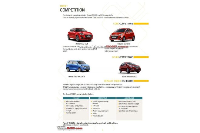 The Renault Triber is going to compete in the compact hatchback segment in India. This space is currently dominated by the likes of Maruti Suzuki Swift and the Hyundai Grand i10. The leaked document states that the Triber’s core competitors are going to be these two vehicles. Furthermore, it will also pitch as a possible alternative to the Maruti Suzuki WagonR and in an upper segment, the Maruti Suzuki Ertiga. Going by this, we can safely speculate that the prices of the Renault Triber will fall in-between the range of Rs 5 lakh to Rs 8 lakh.