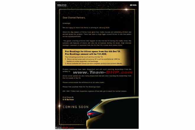 The automotive forum has released an official message from the manufacturer to its dealer partners suggesting that the Altroz will be officially unveiled for the Indian market on December 3, while vehicles will begin arriving from December 4 when the dealers can begin accepting booking amount for the vehicle. The pre-booking amount as suggested by the report stands at Rs 21,000 for the Tata Altroz and further details and brochure for the model will also be available from December 4.