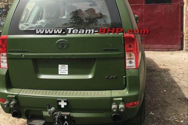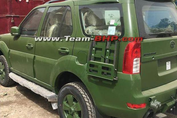 Tata Safari army spec SUV gets black and beige interiors, reading lamps in the front and middle rows along with a manually operated Subros air conditioning unit. It will also feature dual airbags and ABS. Exterior changes include matte green paint job exclusive for the Indian Army, provision to attach jerry cans on the rear left and black-out lamps. The chrome has been replaced by either painting it with the exterior colour or with regular black shade. Engine duty on the army spec Tata Safari Storme is taken care by the 2.2L Varicor engine that sheds a power of 154 bhp and 400 Nm of torque mated with a 6-Speed gearbox.