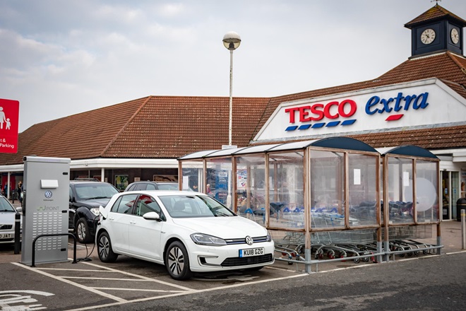Britain’s biggest retailer Tesco and German car maker Volkswagen have joined hands to develop an electric vehicle charging network in the UK. Under the alliance, Tesco and Volkswagen roll out over 2,400 electric vehicle charging bays across 600 Tesco stores in the next three years. Electric cars and other vehicles using alternative fuels account for about 6 percent of sales in Britain and are the fastest growing part of the market, rising 22 percent so far this year, helped by government schemes supporting them. The charging bays will be installed by Pod Point, which has installed over 2,500 publicly available charge bays at locations including retailers, service stations and transport hubs. Pod Point said the Tesco/Volkswagen deal would lead to a 14 percent increase in the number of public charge bays in Britain.