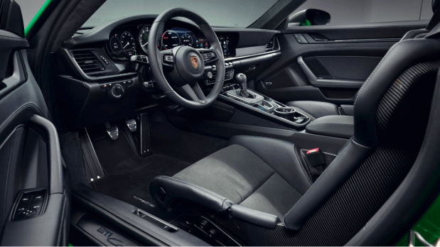 The 2023 911 T’s interior is a mix of dark grey, matte black and glossy black accents. It gets standard front seats with four basic adjustments but can be upgraded to add 18-way adjustments. Porsche also includes a package that adds stitched upholstery, 911 logos on the headrests, and seat belts in gray or green shade. The costs of these extra’s is not revealed yet.