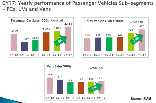 Compound Annual Growth Rate (CAGR) in passenger vehicles sales grew by 3 percent in 2017 when compared to 2016. Despite the shift to GST and addition of cess on SUVs and luxury cars by the GST Council, the automakers have managed to post decent growth in 2017. Many automakers do believe that impact of demonetization and GST did slow down the growth rate in 2017 which otherwise would have seen a double-digit growth.