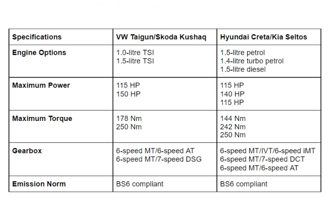 Volkswagen Taigun vs Hyundai Creta vs Skoda Kushaq vs Kia Seltos: Engine Specifications