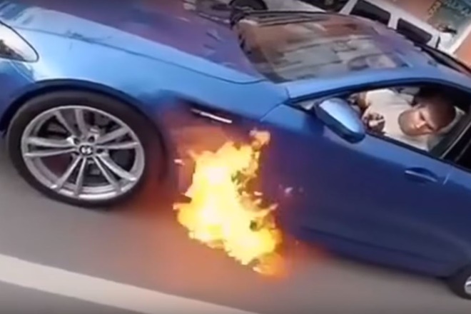 Some people like to refer to their car as a hot ride, even if it is so mildly. But this guy in the video does really have a very hot car, well, quite literally. The owner of a BMW was taken by surprise when the underbelly of his car started bellowing bright yellow flames. The video was taken by a man on a motorcycle, who warns the driver of the M5 and later had to chase it a bit.