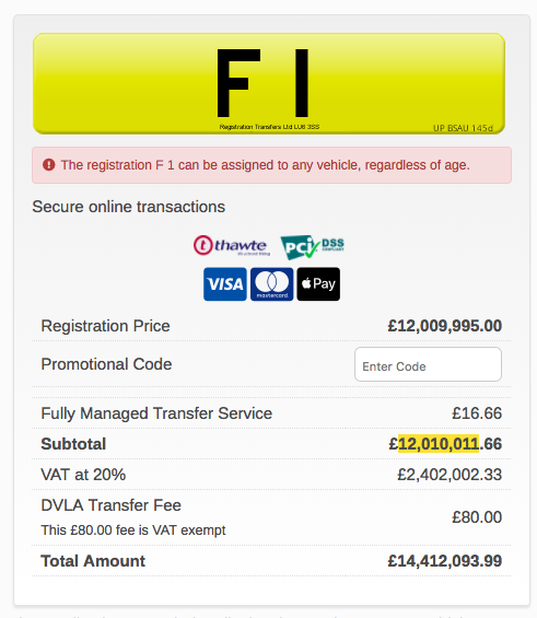 The price of the plate itself is “just” Rs 110 crore or so, but after 20% Value Added Tax (VAT), transfer fees the total price comes to over Rs 132 crore. This number plate has been officially been listed on UK’s Regtransfers website. If the F1 number plate does end up being bought by some crazy F1 fan, it will be the most expensive license plate ever sold in the world.