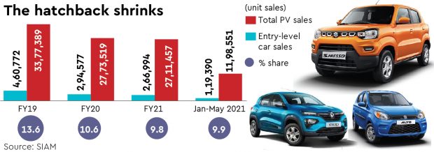 Entry-level hatchbacks —cars shorter than 3,600 mm in length and engine smaller than 1.0-litre — continue to lose traction amongst customers because of which manufacturers have also slowed down on new models and variants. In FY19, hatchbacks formed 13.6% of passenger vehicle (PV) sales, and had five popular models — Maruti Suzuki Alto, old Wagon R, Hyundai Eon, Renault Kwid and Tata Nano. In FY20, their share dropped to 10.6%, with Tatas discontinuing the Nano and Hyundai the Eon, and Maruti Suzuki discontinuing the old Wagon R, but launching the S-Presso. In FY21, the share further dropped to 9.8%, with just three models (Alto, S-Presso and Kwid), and marginally increased to 9.9% in the first five months of CY2021.