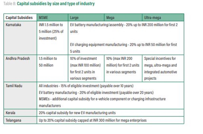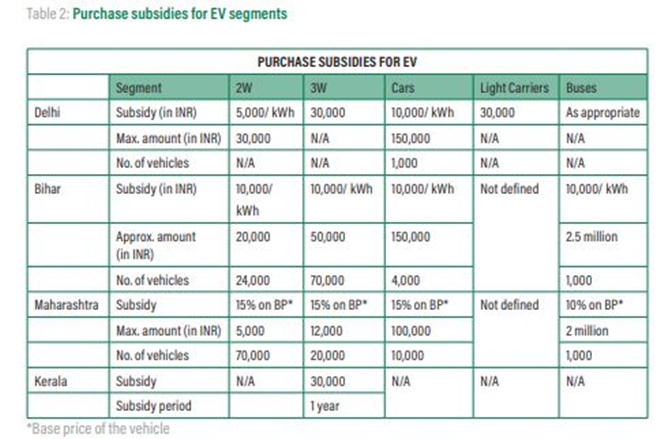 Delhi and Maharashtra provide purchase subsidies across multiple small vehicle segments for eligible EV models and a defined number of EVs in each segment. Bihar offers purchase subsidies for the first 100,000 vehicles manufactured within the state, including strong hybrids. Kerala offers a purchase subsidy on electric three-wheelers, while Tamil Nadu promises an undefined subsidy amount for state transport undertakings (STUs) to purchase e-buses. While Maharashtra’s and Kerala’s subsidies are based on the vehicle’s purchase price, Delhi’s and Bihar’s subsidies are provided on the battery size of vehicles.