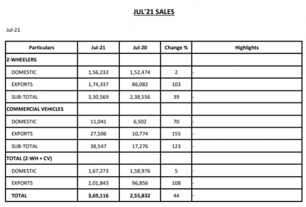 Now, summing up these numbers, Bajaj Auto sold a total of 3,30,569 two-wheelers last month in comparison to 2,38,556 units sold in July 2020. That said, the company reported a positive sales growth of 39 percent in July 2021 when it comes to bikes and scooters. Now coming to the commercial vehicle sales by the company, Bajaj Auto sold a total of 38,547 CVs last month compared to 17,276 units sold in July 2020. That said, the company reported an impressive 123 percent growth in this area.