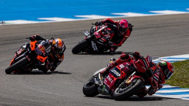 Pecco Bagnaia showcased his hunger to win the grand prix and earned a hard-fought victory at Jerez. Starting from P5, he was quick off the blocks at was third behind Miller and Binder. The drama unfolded on Lap 4 when Binder blazed past his Australian teammate for the second time on the final turn to take the lead. With Miller feeling flustered after losing P1, Pecco took advantage of this and muscled past the KTM rider in the next lap. Temperature between the two riders started soaring as Miller wildly gestured to Pecco showing his frustration on this overtaking move.