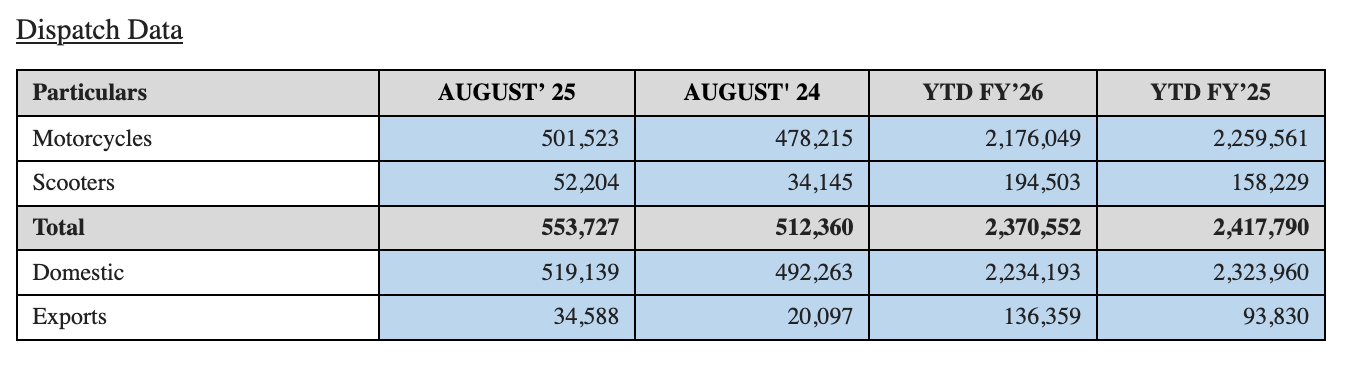 Hero MotoCorp dispatched 553,727 motorcycles and scooters in August 2025, reflecting an 8% growth compared to August 2024. The Company’s global business sustained its strong performance, delivering robust growth during the month and achieving rapid year-to-date growth of over 40%.