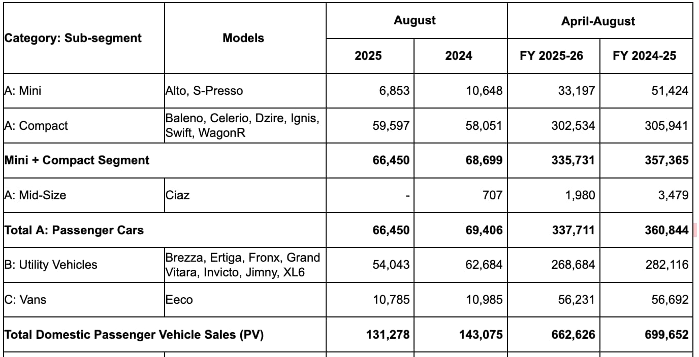Here’s a quick snapshot of segment-wise sales for Maruti Suzuki in August 2025.