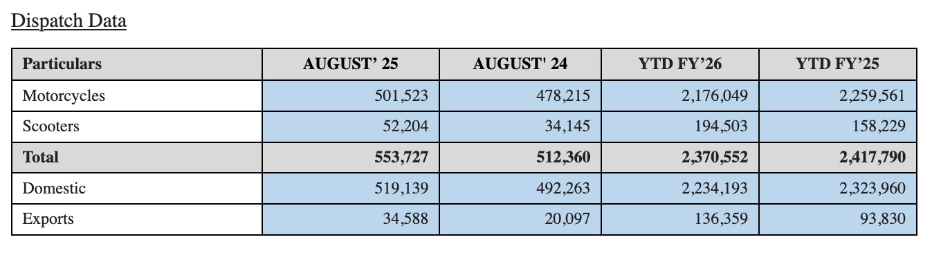 Hero MotoCorp dispatched 553,727 motorcycles and scooters in August 2025, reflecting an 8% growth compared to August 2024. The Company’s global business sustained its strong performance, delivering robust growth during the month and achieving rapid year-to-date growth of over 40%.