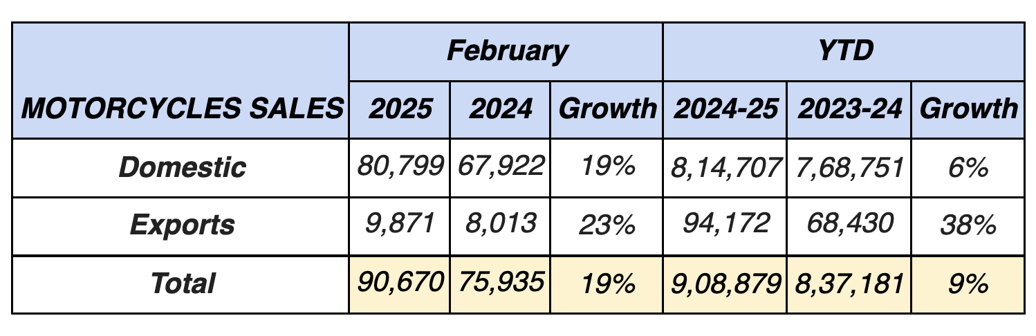 Royal Enfield posted monthly sales of 90,670 motorcycles in February 2025, up by 19% during the same month last year. Royal Enfield exported 9,871 motorcycles during the month as compared to 8,013 during the same period last year.