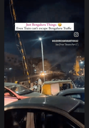 Sudhir Chakravarthy, an Instagram user shared the video of a train stuck in a traffic jam at a railway crossing along with other commuters. The incident took place in Munnekolala railway gate, close to the Outer Ring Road.